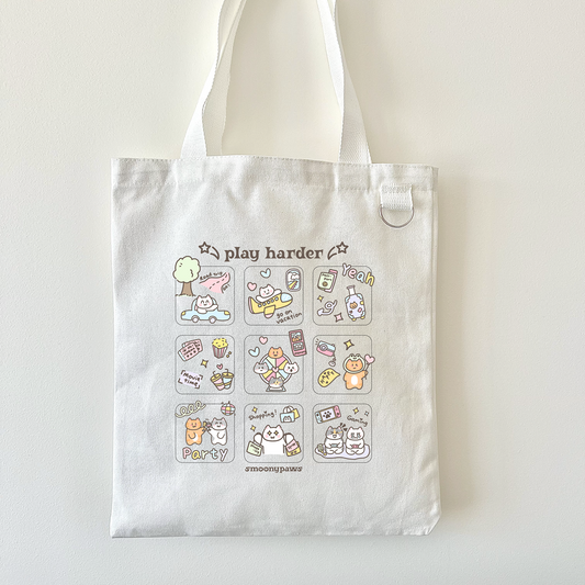 Play Harder Tote Bag, Cute Kawaii Cat Canvas Tote, Trendy Canvas Bag for Shopping, Work, Fun Gift for Cat Lovers