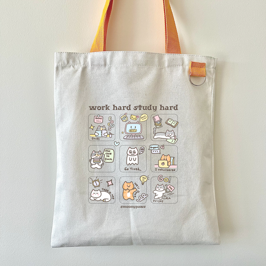 Work Hard Study Hard Cute Cat Tote Bag, Kawaii Aesthetic Trendy Canvas Bag for Students, Office, and daily use, Fun Gift for Cat Lovers